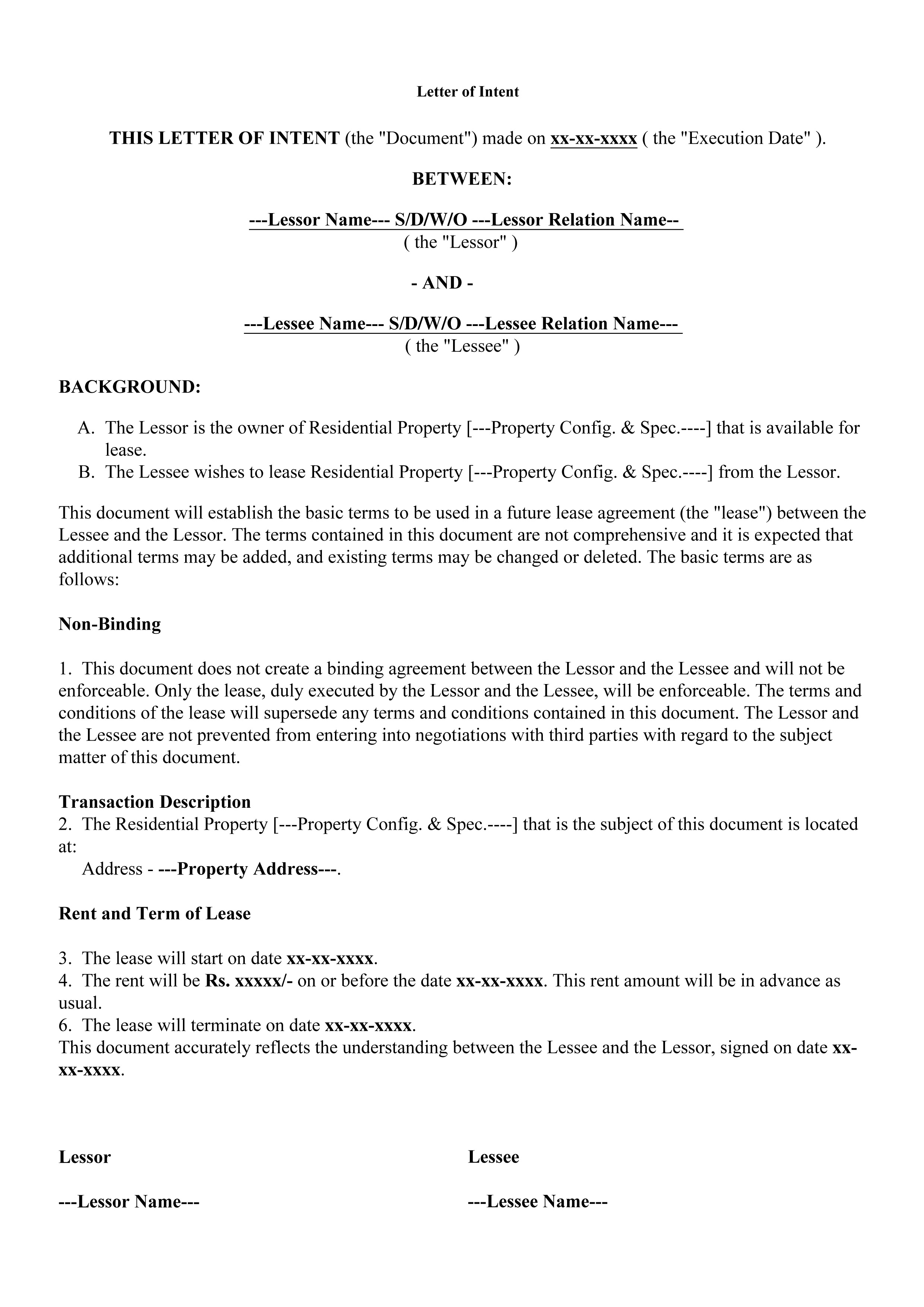 Letter of Intent (Lessor-Lessee)